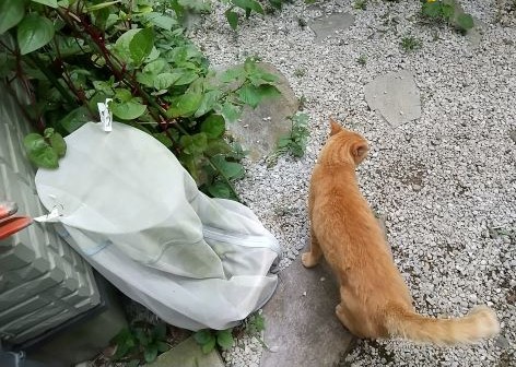 7日の気温は猛暑に届かなくても、湿度が高く蒸し暑かったさいたまです ↑ 2本目のキュウリ、先日の様子 6月初めに植え付けして、7月半ばからチラホラ花を咲かせて7月末に1本目を収穫していました。 2本目ももうすぐ収穫~~と、楽しみにしていましたが、 ↑ 2本目が下がっていたはずのツルから消えました ↑ 足元に、無残な姿で発見 膨らんでいた中玉トマトも青いまま落とされていました。 近所の貸し農園では、トマトやスイカの他にキュウリもカラスに食べられると聞いた事はありましたが、1本ずつしか収穫できないような我が家の畑まで狙われるとは思いませんでした。 ↑ こちらも先日の中玉トマトの様子 場所が悪かったのか梅雨明け後の急な日照りがキツかったのかわかりませんが、成長が微妙でした。この2個だけは収穫できそうでしたが、2個とも消えました ↑ 先に色づいていた中玉トマトの残骸も発見。 ↑ 食べられずに落っことされていた青い中玉トマトは、無傷ですがミニトマトサイズです。 刻んでミートソースにでも混ぜてしまいましょう。 中玉トマトは、立派に育った姿を見ることなく終了です 色んな種類を育てようと苗は1本ずつしか買っていないので、育ちがイマイチになると全滅もありますね。 ↑ うどんこ病もウリハムシもつかず安心していたら、鳥害があるとは…… 野良ニャンがうろちょろしてくれていますが、カラスはちょっとした隙を狙っていますね ↑ キュウリの3本目は早めに収穫しようと思います。 カラス避けも考えなくてはいけませんね。鳥除けネットで包めばいいかしら。 本日の野良ニャン ↑ 暑い時期は茶ロング君のお庭パトロールも控えめになります