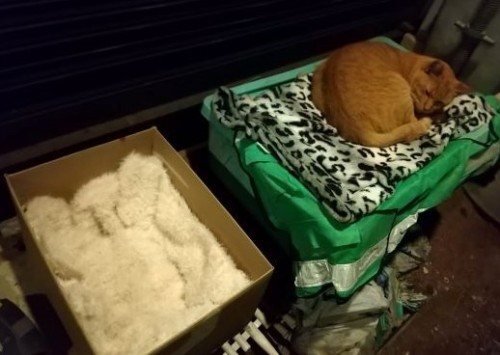 22日は時々薄日が出る時間はあったものの、雲の多い一日だったさいたまです 10月にゃんにゃん日、今年も野良ニャン用に段ボール箱を置きました ↑ 古いフリースやボア毛布を入れた段ボール箱を、ガラクタ置き場に置きました 夜に見に行ってみると、茶ロング君が箱の外で寝ていました。 まだ、箱入りするほどの寒さではない様子(笑)。 ↑ 挨拶は頭突きの仲良し白黒姐さんと、今年の冬も一緒に箱入りして暖かく過ごしてほしいです。 ↑ ボランティアさんが去勢手術させてくれている近所猫の茶ロング君(5歳) ナデナデ大好きな甘えん坊さんですが、お口の周りが汚れているのは拭かせてくれません。 でも、ご近所で美味しいものをたくさんもらっているので、皮下脂肪も準備万端 お腹も背中もポヨッポヨで、元気に遊び回っています