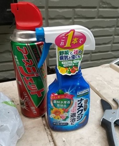 15日は雲が多く、過ごしやすい陽気だったさいたまです 本日の日記は毛虫写真がたくさんあります ↑ 手近にあった薬剤と殺虫剤 ↑ ちょっと裏庭に出ると、虫のフンらしき黒粒が大量に落ちているのを発見 ↑ 見上げてみると、スモモの木にモンクロシャチホコと思われる毛虫が大発生 2017年8月末にも大発生して、まだ野良子ネコだったクツシタちゃんと一緒に退治した記憶が。 ↑ 手の届く部分はビニール袋に枝を切り落としながらアースジェット ↑ 手の届かない木の高い位置は、ナメクジや毛虫にも聞く殺虫剤を直噴射しました。 こういうスプレー容器でも、直噴射だと2メートルくらい上まで届きました。 庭仕事をサボっていたら、虫の大発生に気付けず木の全体に広がってしまいました 今回は4センチくらいまで毛虫が育ってしまいましたが、なるべく小さい内に早期発見して退治したいですね……。 大きい毛虫の集団も嫌ですが、ハチの巣なんかが大きくなっていたら大事なので気をつけたいです。ナメクジ 殺虫剤 サンヨール液剤AL 400ml エムシー緑化 家庭菜園 園芸 ガーデニング 初心者向け ビギナー向け ↑ ナメクジ退治とありますが、うどんこ病や毛虫退治など色々な病害虫に対応しています。 広い面に噴射できる霧スプレーと、木の上の毛虫発生箇所にも届く直噴射が切り替えられる容器も便利です。 本日の家ニャン ↑ ハンモックのクツシタちゃん、大あくび 2017年の夏にスモモの毛虫退治をした時はまだ外にいた子猫でした。 うちの子になって、元気に大きくなったものです。 でも外に興味をもって脱走すると困るので、首輪と迷子札は外せません。