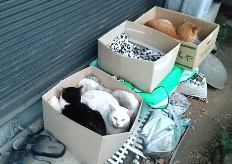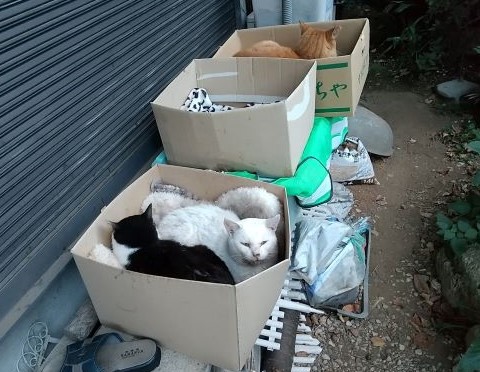 22日は昼頃まで雨が降り、午後は青空が見えていたさいたまです 12月にゃんにゃん日、庭の常連野良ニャンズがついに御一緒しました 2022年の22日も今回で最後。早いものです。 ↑ ガラクタ置き場の常連野良ニャンズ 並べた段ボール箱、それぞれ好きな場所に入っています。 オジマさんも白黒姐さんと一緒なら、同じ箱に入れるようになっていました。 ↑ 尻尾だけシマシマ模様の白猫、オジマさん 撫でても良いモードの時もありますが、人間が近付くと距離を取ってしまう事も。 生粋の野良だったオジマさんは、我が家の庭へ姿を見せるようになって8年近く。 以前は冬にだけエコキュートで暖まりに来て、春になると旅立ってしまう旅猫さんでした。 でも高齢のためか、数年前から春になっても旅立たずに庭の常連になりました。 オス同士なので茶ロング君とは、なかなか仲良くなれませんでした。 でも白黒姐さんの仲介もあり、最近は寒さも増して距離も近付いています ↑ そしてついに、3匹が一緒に箱入りするようになりました オジマお爺ちゃんが一番下で重そうですが(笑)。 皮下脂肪と冬毛でポヨポヨの茶ロング君は、温かい肉布団になっている事でしょう 野良猫の避妊去勢手術をしたりご飯をくれているご近所さんが、体調を見て動物病院に連れていったり薬をくれたりしています。 ご近所生まれの茶ロング君と違って、オジマさんや白黒姐さんは捨て猫か脱走猫かわかりませんが、ご近所で可愛がられる近所猫になっています。 みんなで寝床にも入れるようになって安心~ これからもっと寒さが厳しくなっても、温かく過ごせそうです ↑ ついでに家ニャンズは、ちゃんちゃんこの中で猫団子 仲良し姉妹はいつも一緒にぬくぬくしています(*^_^*)