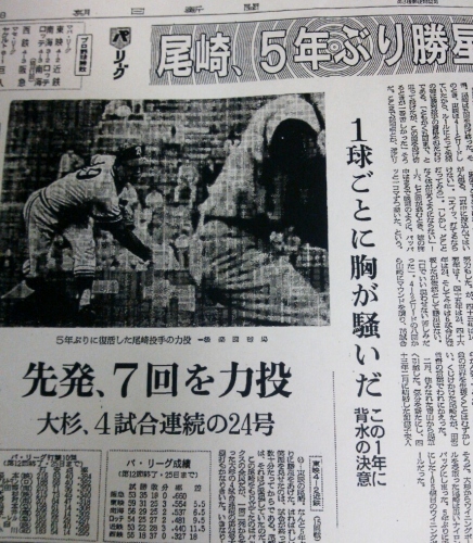■先日、故・尾崎行雄さんが経営していたお店をひさしぶりに訪ねた。6月13日に亡くなってからしばらく休業していたが、ボクが行ったのは、久々にお店を開けた数日後のことだった。テーブルの側には、大量の新聞記事の切り抜きが入ったビニール袋が置かれていた。お願いしてその記事を見せていただいた。上から順に手に取った。するとどの切り抜きも昭和47年6月26日のものだった。日刊、サンスポ、スポニチ、報知、ナイガイ・・・。不思議に思ったが、記事を読んでいくうちに理解した。それらはすべて、記事の前日(6月25日)、尾崎さんが近鉄を相手に5年ぶりに勝ち星を挙げたことを取り上げていた。浪商、そしてプロで華々しい活躍を見せた尾崎さんだったが、肩の酷使がたたり、昭和42年8月25日(対西鉄)を最後に勝ち星から遠ざかっていた。肉体的にも精神的にもきつい5年間を過ごし、やっとつかんだ尾崎さんの勝ち星を伝える記事だったのだ。そしてこの切り抜きは、家族にとっても忘れ難い大切な思い出だったに違いない。■以下、朝日新聞(昭和42年6月26日付)より引用。※写真は、今日図書館に行って朝日新聞DB「知恵蔵」から印刷したもの。(後楽園)近鉄 001 000 100 =2 東映 110 200 00X =4(近)●清‐芝池‐板東、(東)○尾崎‐山崎‐宮崎「勝ちたい」、神にも祈った。「口では言い表せない苦しみだった」。4-2とリードの8回から山崎にマウンドを譲り、久々に1勝を挙げた。37年の新人王、日本シリーズでの優勝。数々の実績をもつ尾崎は昨年暮れ田宮謙次郎監督に引退を申し出た。ところが田宮の返事は「もう1年頑張ってみろ」。今年2月、住み慣れた青山から浅草に引っ越した。気分を新たにし、加津子夫人に初勝利を味わせてやりたかったためだという。救援の宮崎が北川を一ゴロに打ち取り試合は終わった。「尾崎おめでとう」。ナインが尾崎をさがした。が、いない。ベンチ裏のトレーナー室にかくれていた。「こわくて見ていられなかった」そうだ。大杉からウイニングボールを受け取った尾崎は黒いナイロンバッグにしまった。5年ぶりに手にした105個目のウイニングボールだった。■新聞には、その試合のメンバーが記載されていた。スタメンのみメモしておきます。【近鉄】(中)小川(二)クオルス(右)永淵(左)土井(遊)一枝(一)北川(三)関根(捕)児玉(投)清【東映】(三)高橋博(左)三沢(一)大杉(中)張本(遊)阪本(捕)加藤(右)千藤(投)尾崎(二)大下(写真)尾崎行雄5年ぶりの勝利を伝える朝日新聞(昭和47年6月26日付)今日も1クリックお願いします