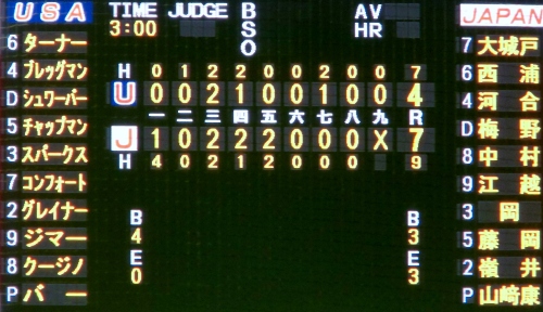 ■昨日(7月11日)、日米大学野球第5戦を観戦した。2勝2敗で迎えたこの試合が最終戦。、思わぬ伏兵が日本代表チームを優勝に導いた。それは岡大海(明治大4年、倉敷商高)である。ただ岡は本塁打を打ったわけではない。貴重な適時打を放ったわけでもない。打撃成績は3タコと1つの死球である。 その死球こそがチームを救った。(写真)スコア■追いつ追われつの好ゲーム。そして4回裏、ドラマが起きた。一死後、7番・岡が打席に立った。初球、なぜか岡はセイフティバントの構えをみせ、身体が前方に傾いた。すると投球は岡の足に当たってしまった。倒れこみ、苦悶してのけぞる岡。そして立ち上がりかけた瞬間、被っていたヘルメットをはぎ取ると、思い切りグラウンドに投げつけた。 (写真)安打はなかったものの、この試合の真のMVPは岡大海である■グラウンドでは両軍ベンチから監督・コーチ・選手たちが飛出し、一触即発のムードに。審判団が必死に両軍をなだめて事なきを得たが、この岡の戦闘姿勢が日本代表ナインの心に火を点けた。その後、四球、盗塁、ワイルドピッチでチャンスを作ると、9番・嶺井博希(亜細亜大4年、沖縄尚学高)の適時打と1番・大城戸匠理(法政大4年、藤井学園寒川高)の内野ゴロで2点を追加した。さらに5回裏には4番・梅野隆太郎(福岡大4年、福岡工大城東高)、5番・中村奨吾(3年、天理高)が連続本塁打を放ち、勝利を決定づけた。(写真)梅野隆太郎。5回、レフトスタンドに本塁打を放つ(写真)中村将吾。梅野に続き2者連続本塁打を放つ■前回のブログで、ボクは岡を「脱力系」の選手と書いたが、それは完全な誤りだった。岡は熱い闘志を秘めた頼もしい選手だった。訂正するとともに深くお詫びする次第である。(写真)優勝を決め喜ぶ日本代表ナイン今日も1クリックお願いします