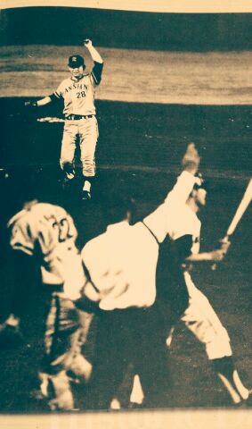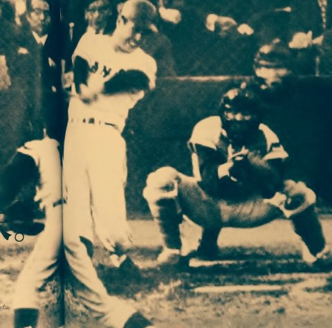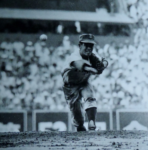 ■なぜか大和球士さんは、『野球百年』(時事通信社)に1971年(昭和46年)のことを何も書いていなかった。この年、オールスターでは江夏豊が9者連続三振の大記録を達成し、日本シリーズでは王貞治が山田久志からサヨナラ本塁打を放つなど、名場面が多かったのに。仕方がない。大和さんの記事なしで書くことにしよう。今回のタイトルは、「真夏の夜の夢、江夏豊の9者連続三振」。■前年(70年)に心臓発作を起こして以来、ニトログリセリンを手放せなくなった江夏豊は、ある日、主治医にこう言われた。「豊は女が好きだな。酒もやるわね。たばこもやる。麻雀もやめられんわな。おまえの体はただでさえ心臓に負担のかかることをしている。どうだ、四つのうちひとつだけやめないか。そうすれば命だけは保証する」。その話を聞き、江夏は「酒をやめる」と即答した。9者連続三振の大記録を達成したのは、7月17日のオールスター第1戦(於、西宮球場)。宣言どおり酒こそ飲まなかったが、前夜から徹マン(徹夜麻雀)をして、この試合に臨んだ。(ちなみに、「江夏の21球」で有名になった1979年の日本シリーズ第7戦前夜も麻雀をしていた)■相手(パ)の1回の打者は有藤、基、長池、いずれも三振。2回は江藤(愼一)、土井(正博)、東田、これもすべて三振に仕留めた。これで6者連続。これまで5連続三振は、金田が3度、稲尾が1度、そして江夏自身が前年に1度達成しているが、6者連続は史上初。東田が三振に倒れると、スタンドの歓声が「ワァー」から「ウォー」に変わった。そして、江夏自らの3点本塁打などで4点を奪った直後の3回、江夏がマウンドに上がると、球場が異常なほど静まり返っていた。江夏の証言によると、この静けさにより江夏は冷静さを取り戻し、大記録達成に向けて後押しした。7番の阪本、続く岡村も三振。そして9番目の打者は加藤(英司)。この加藤はカウント1-1からキャッチャー後方にファールを打ち上げたが、捕手・田淵はすぐに追うのをやめた。江夏が9連続三振を狙っているため、邪飛の捕球をやめたのだ(なお、捕球しようとした田淵に、江夏が大きな声で制止したという説もある)。結局、江夏は、加藤から空振り三振を奪い、9者連続三振の大記録を達成した。■江夏の記録は、ここで終わらなかった。オールスター第3戦(於、後楽園球場)も三番手として登板して江藤から三振を奪い、前年のオールスターから15者連続三振を達成した。そして16人目の餌食として打席に立ったのは野村(克也)である。以下、江夏の話。「野村さんはバットをうんと短く持って、絶対に当てようとしてるのが見え見えでした。僕は吹き出しそうでしたよ。野村というのは、こんなおっさんかと思った。三振を取られまいと必死だったんでしょうね」そして野村は初球、真ん中に入った直球をバットに当ててセカンドゴロを打ち、江夏の記録は途切れた。後に、南海に移籍して野村監督のもとでプレーすることになろうとは、この時、江夏自身知る由もない。(参考文献)『左腕の誇り~江夏豊自伝』(新潮文庫) (写真)2回裏、6人目の東田が見逃し三振。投手:江夏、捕手:田淵。~『スポーツ20世紀 名勝負伝説』(ベースボールマガジン社)より