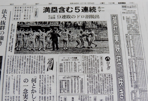 前回の続き。 ■先日、大和球士著『野球百年』(時事通信社)には1971年(昭和46年)に関する記述がない、と書いた。しかし、それは私の早合点であった。ちゃんと2件について記載されていた。関係各位の対してお詫び申し上げます。さて、今日はその1つ、東映フライヤーズの「5連続本塁打」を。大和さんは、前日まで9連敗中だった東映を皮肉交じりに、こう書いた。「5月3日、東京球場で、ロッテ対東映5回戦が行われた。観衆約一万。東映はピリピリ。-2勝14敗1分の、さんたんたる成績であった。勝率1割7分6厘。監督田宮謙次郎が40歳代の若さなのに、にわかに白髪頭になったのは、この頃であった。弱いチームはやはり弱い、9回表、4点も負けていた」。■ここで、この試合の8回までのスコアをご覧いただきたい。東映 000 010 00ロッテ 000 301 029回表、東映は大杉勝男のソロ本塁打が飛出したものの、すでに二死走者なし。4点差があっては、だれもが東映の10連敗を確信していた。そして安打と四球で2人の走者が出るも、次打者の代打・末永の遊ゴロ。しかし山崎二塁手にトスされたが、山崎がポロリ。が、判定はアウト。そして、東映からの抗議であっさりと撤回。これは完全捕球しておらず前川塁審の完全なミス。相手が9連敗中の東映、しかも4点差もある。ロッテは余裕をもって判定撤回を受け入れ、いったんベンチに引き揚げた選手たちが、あらためて守備位置についた。ところが、次第に妙な空気が漂い始めた。2本の連続安打と野選、エラーが続き、あっという間に東映が同点に追いついたのだ。その裏、ロッテは無得点で延長戦へ。■あらためて大和さんにご登場願いたい。「ここまででもご報告する値打ちはあった。とにかくいったんは試合が完全に終了したのに再開したのだから。-幻の試合終了とでも題をつければ一篇の野球奇談ができあがるだろう。実際は、幻の試合終了篇が片付いてから、日本新記録篇なる痛快無双の続編が登場することになる。10回表、東映は二死満塁と攻め込んだ。次は9番打者、投手皆川(康夫)。思い切って代打に作道を立てた。安打の確率は低い。もし凡打に終わったら、10連敗か・・・、こんなことが頭を去来するから田宮の白髪は急増する。代打の作道は、カーブを必死に打った。-左翼ホームラン」作道の代打満塁本塁打で、今度は東映が4点のリードを奪った。この一打で、東映は勢いづいた。続く大下(剛)、大橋(穣)、張本(勲)、大杉(勝)が連続して、いずれも左翼に本塁打を放ち、計8点を挙げて9連敗の泥沼から脱出に成功した。(最終スコア)東映 000 010 005 8 =14ロッテ 000 301 020 2 =6■翌日の朝日新聞(1971年5月4日付)には、「貧打東映狂い咲き」「満塁含む5連続ホーマー」「ロッテと延長、9連敗のドロ沼脱出」などの活字が躍った(聞蔵2ビジュアルより、写真も)。そして、東映ナインの歓喜の様子を表す記事もあった。「日本新記録の5連続本塁打、作道の今季パ・リーグ初めての代打満塁本塁打。東映はこれまでのウップンを一気に晴らすように打ちまくり、9連敗のドロ沼から脱出した。その喜びは金田が最後の打者を三振に打ち取ると、全員がウォーという叫び声をあげて、金田を迎え入れたことでもわかる。半田ヘッドコーチが『二死から奇跡が起こった。こういうこともあるんだぜ』といいながらロッカールームへ。引き揚げてくる選手たちの顔も晴々していた。前日までのうちひしがれ、いまにも泣き出しそうな悲壮さは消えていた」。ちなみに5連続本塁打の記録は、現在も破られていない。今も日本記録のままである。(写真)10回表、東映・代打の作道が代打満塁本塁打を放ち生還する。ベンチから飛出し総出で作道を迎える東映ナイン