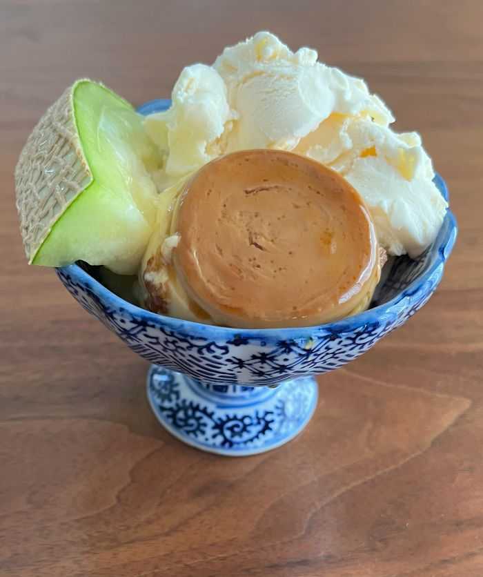 いただきもののメロンと、スーパーで買ったプリンとバニラアイス。