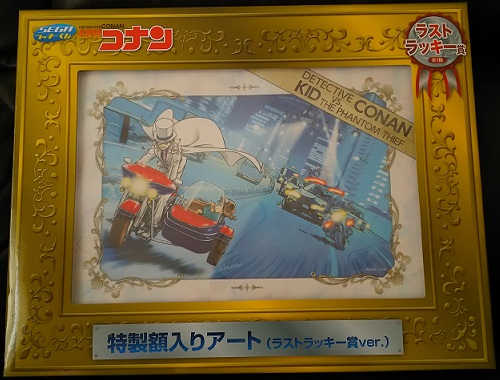 主人がコンビニでコナンくじを引いて来ました。 5枚残ってたので、全部買って来たそうです。 ラストラッキー賞の特製額入りアートを手に入れました。 娘が一番欲しかったA賞コナンフィギュア当たりました。 ラッキーくじC賞ミラー、D賞ポーチ、E賞メタルチャームセットも当たりました。 実はこの前の名探偵コナンくじも主人が引きました。 B賞バスタオルとF賞ラバーストラップが既に当たっているので、 合計3500円でA賞~F賞とラストラッキー賞コンプリートです。