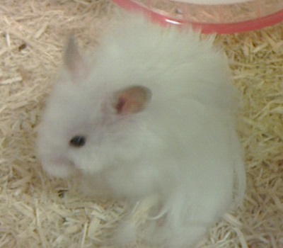 長毛ハムスターのプーは白い毛玉みたいな子です。 毛が長すぎて、おがくずがお尻の毛に張り付いてしまいます。 毛繕いはするのですが、かなり不完全な毛繕いです。 一緒に買って来た新品のケージは気に入ってくれたようで、 入れるとすぐにあちこち歩き回って、餌を食べました。 回し車も1時間も経たないうちに乗って走り出しました。 とっても賢い子です。