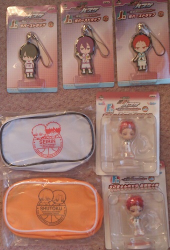 黒子のバスケ一番くじ7回引いたら、赤司くんの ちびきゅんキャラF賞2個当たりました。 保存用と観賞用にしますw H賞ポーチも2個当たったので、火黒と高緑にしました。 J賞ラバーストラップは赤司くん、紫原くん、氷室くんにしました。 今回はくじ運よかったと思います。