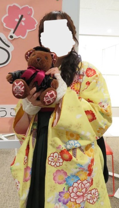 卒業記念にテディベアのぬいぐるみを大学から貰いました。
