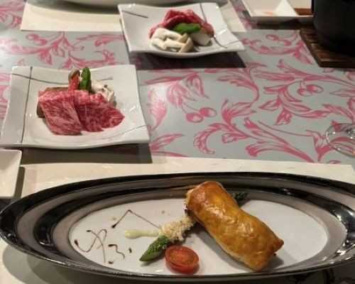 茶碗蒸し、めんたいポテトパイ、特選和牛陶板焼き、御飯、桜豆腐の吸物、
