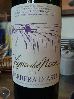 バルベーラ・ダスティ 1997 生産者Trinchero ワインをグラスに注ぐ 綺麗な濃い紫色 そしてゆっくりとグラスを近づけ・・・一番最初に触れるのはそこのイタリアの空気 うれしい瞬間ですね あとは時間をかけてゆっくりと楽しみました 濃縮された果実の香・熟成香がキュンときます。おぉーっ 結構酸味が強いですね。SGギターの高から中音域のタイトなイメージですかね?Radioheadの[just]のギターソロ。張り詰めた上に上がってゆく感じ・・・だんだん香がいろいろでてきました。珈琲の風味?チョコレート?甘い香がやわらかく出てきました! こういうワインは初めてです バルベーラは02,03,04と比較的最近の早くから飲める果実実たっぷりの柔らかなものしか知りませんでしたので、私には新たな味わいでした