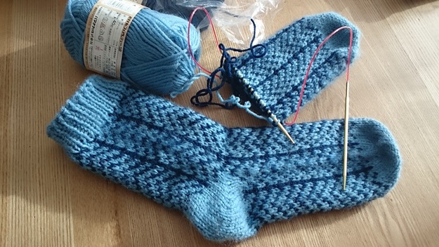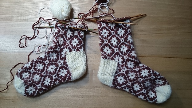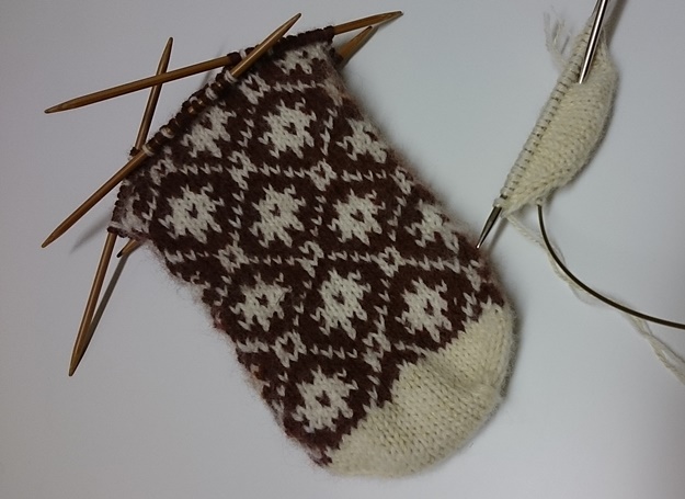 今日から夫は仕事へ。冬休みの子供たちはバタバタして家にゆっくりいる時間は少なく、日常になったなあ、と。家族に「うるさい」と不評のDソン掃除機を、充電が切れるまで使えるのが最高です。2階にも、やっぱりほしいなあ。。いや、それはなくていいものでしょう(胸に手をあてる)。 「手編みのくつした」から、以前編んだ杉綾のくつしたの色違いをつま先から。毛玉も少しつきましたが、今も、他のと回しながらはいています。この本のかかとが、初めて編めたかかとでした。そう思うと、ぐっときます。 ぽっこりしてしまったラップ&ターンかかとのほうは、片方は編みあがり。どちらかのくつしたを終わらせたら、本人がいる前では始められなかった夫用セーターに手をつけよう!長期計画です。