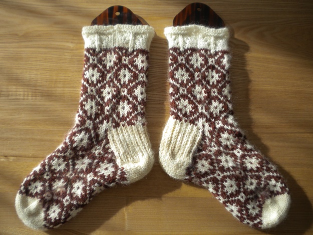 「手編みのくつした」No.23の杉綾の編み込みのくつしたをつまさきから。かかとはitosakuさんの動画 ☆ ☆ の。あともう少し。