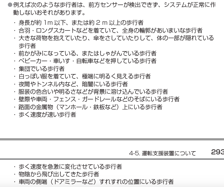 ならばレーダー&カメラ式の緊急自動ブレーキ(プリクラッシュブレーキ)はどうなのだ? と言えば、前方の障害物は背の低いポールとレーダー波を反射しにくい金網ですから、これもレーダーやカメラでは検知/識別するのが困難な物体です。トヨタの取扱説明書にも、ちゃんとその旨が書いてあります。特に、「ドライバーがアクセルを全開にしたりハンドルを切ったりすると解除になる」旨も書いてありますから、これも装置の欠陥ではなく「仕様」です。