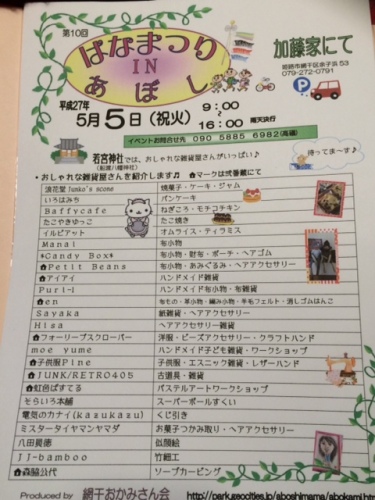 『はなまつり』とは、お釈迦さまの誕生日をお祝いする行事なんです。子供達が白象を曵いて町内を歩くんですよ〜。そしてそして明日は初めての出店地元も地元。。で、何か不思議な気分です。この日の為にちゃ〜んと「古物商許可証」の書き換えもしましたよどの商品を持って行こうか・・・商品の数はこれで大丈夫???とか悩みつつ車に積み込みましたどうなりますやら明日はとってもいい天気みたいなので是非!ドライブがてらにいらして下さい。いろ〜んなお店が出ます。