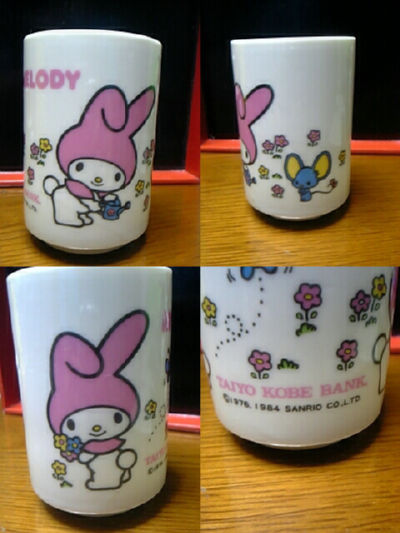 先日うちのマウンテンサイクルより出土したマイメロの湯のみ右下の画像を見ると太陽神戸銀行の文字が!ちなみにもうない銀行です、マイメロを検索してここを見ている人たちはみんなリアルで知っている世代だと私は思い込んでますが一応↓都市銀行たぶん口座開設か何かの粗品で貰ったんでしょうね。ちゃんとフラット君もいます。昨日と今日は1日の来訪者が100越えました。結構うれしいです。これからもよろしく「お願い」