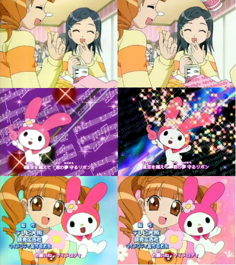 どうやら前回からOPがマイナーチェンジしてたみたいなんですが、今回は顕著だったのでやっと気づきました。まだ10時くらいに視聴したので気づくことが出来ました。とろけてない脳の状態のときに見ることもあるんですよ。んで、上段左が今回の7話からの新OPです、ドリンクが上のほうから左に飛んでいきます、ついでにハンバーガーかなんかの袋にロゴが入りました。中段、下段は6話からの変更です。すべて右が新しいものです。中段のは黒くなり過ぎてて前のほうがよかったんじゃないかなぁと思えます、マイメロの腹黒さに合わせたんでしょうか? そして今回のお話ですが、バグが影分身します。でも、続きは明日。って思っていたらドリンク含め6話から変わってたorzしかも何この間違え探しみたいな修正・・・もしかしたら他にもあるかも。