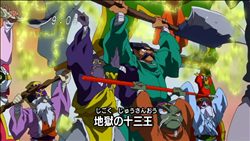 地獄の13王、左上から閻魔大王、五官王、宗帝王、慈恩王、祇園王、五道転輪王、蓮華王、平等王、初江王、変生王、泰山王、秦広王、都市王 今回は何も話は発展せずに十三王の紹介のためだけにあったような話でしたね。天邪鬼や手の目もなんだかいまいちでしたし・・・雨降り小僧が出てきたのが個人的に嬉しかったです。