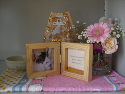 1月9日、朝普通どおりに出勤しました。いつもは、まず『ぼたん』におはようを言いに行きます。でも、その日は鈴がティッシュをばらまいていてそれを片付けて、何故かそのまま窓を開けに行きました。そして振り返るとぼたんのトイレの横に白いものが横たわってました。一瞬‥わかりませんでした‥震えがきて‥ そのまま、外に飛び出しました。丁度、相棒が出勤してきて‥二人でぼたんの側に行って抱き上げました。すっかり冷たくなっていました。心臓がえぐりかえるような痛みと涙があふれて止まりませんでした‥二人で頭をゆっくり撫でて体をさすりました。小さい箱を用意してキレイな毛布とバスタオルでくるみました。目から上全部が別物のように重く、熱くなってました。ペット霊園に電話をして、12時の火葬の予約を取りました。お花を買って、ぼたんの好きだったカリカリを持って‥自分の手でニャン国へ送ったのは初めてでした。細い細い骨‥骨の感じから年はかなりとっているでしょう‥と言われました。きれいに骨壷に納めて、ぼたんに似合うような透明の飾り数珠をつけました。 『ぼたん』との出会いは3年半前です。餌場に初めから来ていた子でした。とっても小柄で、ご飯を持っていくと「ミャーミャー」言いながら後を追ってきました。近づくと車にスリスリしながら喉をゴロゴロ鳴らしてくれました。 『ぼたん』を保護したのは昨年の6月‥駐車場でぐったり寝ている日が多くなっていたので保護しました。病院で検査してもらうと、たくさん病気を持っていました。まずは、「猫エイズ」のキャリアでした。これは、発症してなくストレスを少なくして家で飼うことによって発症を抑えられるということでした。次は、「心臓肥大」体の割合からすると2割以上心臓が大きく、負担がかなりかかるとのことでした。保護した当初は呼吸が早かったのですが注射とお薬でスゴクよくなりました。野良ちゃんでよくここまで生きたね!と先生に言われました。最後は「肝臓疾患」肝臓の数値が非常に悪く、これが一番深刻でした。『ぼたん』にあまり負担をかけない治療法を選び、肝臓のお薬を毎日服用しました。‥『ぼたん』は本当に幸せだったかな?毎日そればかり考えてます。家に保護してからメッキリ元気がなくなったように見えました。昨年11月初旬頃、おもらしをするようになり、小さなトイレをベットのすぐ前に設置しました。もちろん、ご飯もお水も‥最後の2ヶ月は、ご飯をあげると少し"スリスリ"してくれたり喉をゴロゴロ鳴らしてくれました。わがまま婆さんで、ウエットフードを人肌に温めないと食べてくれなく、最後の食べづらい部分はスプーンで食べさせないと食べませんでした。(苦笑)ベットに寝たまま!!本当にかわいい子でした。 ぼたん‥‥ニャン国はママのブログ仲間の子供達がたくさんいるから‥仲良くしてもらうんだよ‥いたらないママだったけど‥許してね‥本当にごめんね‥今度生まれ変わっても一緒にいようね‥ぼたん‥ありがとう‥そして‥皆さん、励ましの言葉‥ありがとうございました‥どんなに心強かったか‥皆さんに出会えて本当に良かった‥私も『ぼたん』も幸せです!