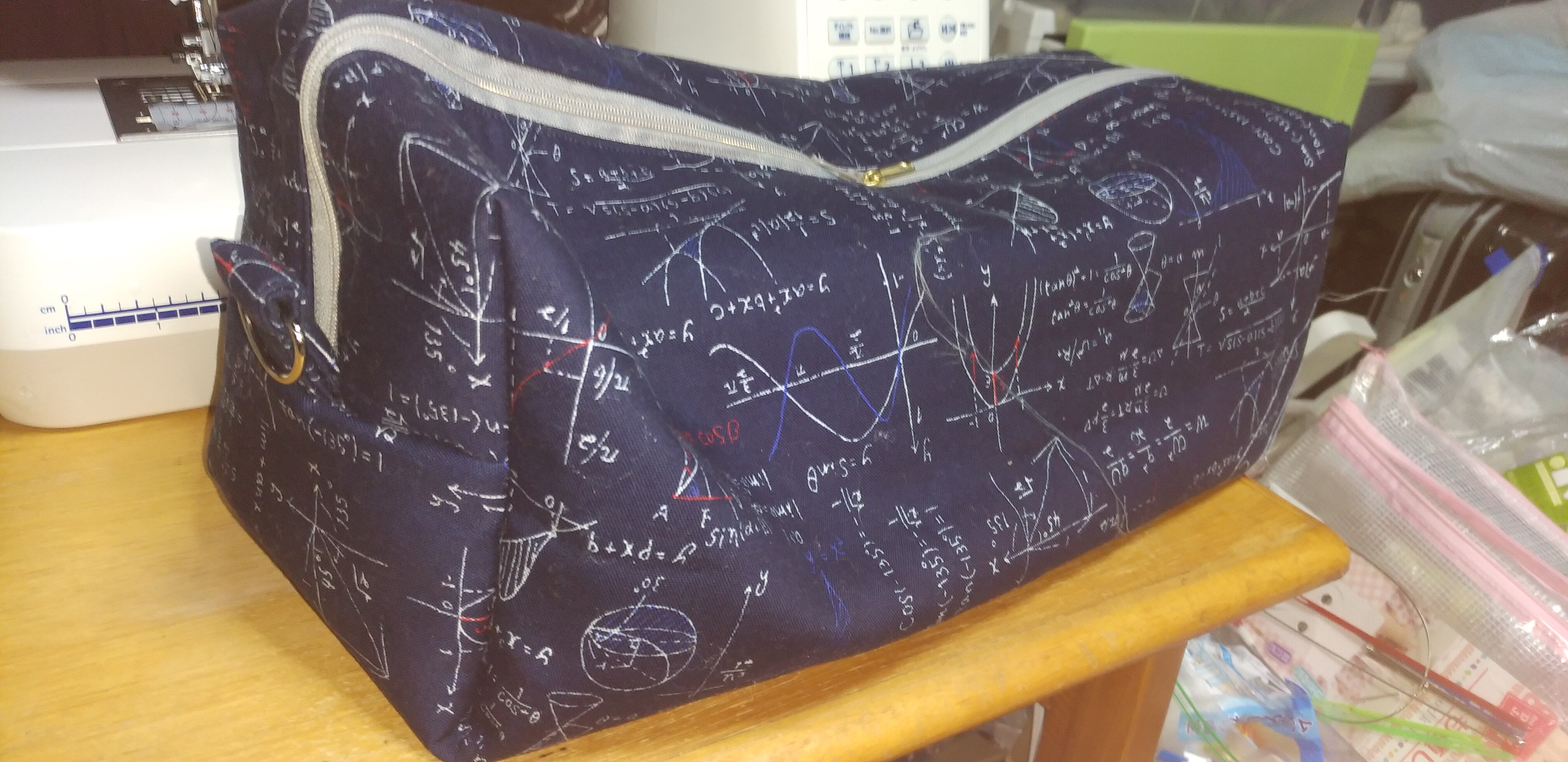 柄は数字の板書のように数式やグラフが描かれている物で、以前に色違いの生地で開襟シャツを作ってあげたのですが、その余り布でパッチワークしたバッグを愛用してくれていました。
