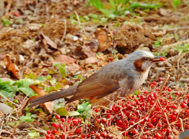 庭木のナンテンの赤い実を切り取って、ヒヨドリを待ちました。ヒヨドリ
