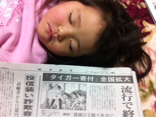 今朝の新聞今朝の新聞です。【ン・・・・・】よく見てみます。【伊達直人:タイガーマスク】漫画の一こまを使うところがうまい!!!いい話です!!