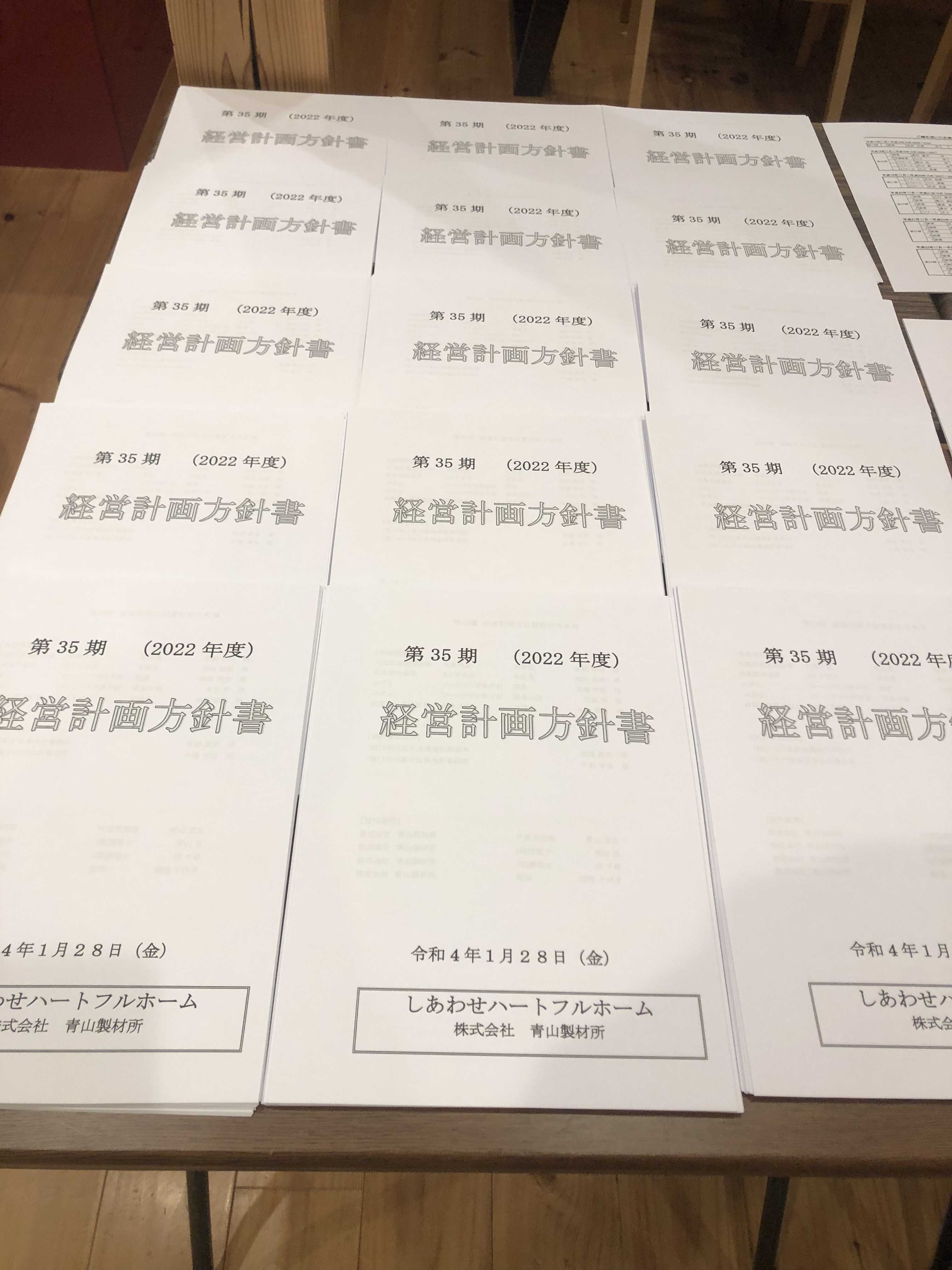 昨夜は、マジな徹夜となりました。本日は、日付が変わる前に帰ります。第35期の経営計画方針書…工務店経営に業態転換してから、毎年開催しています。業態転換したのは、平成19年です。16冊目の、経営計画方針書は…明日、製本します?大切な、青山製材所の設計書です。