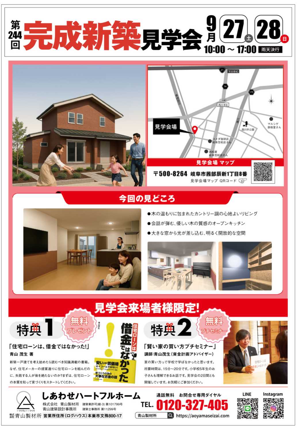 第244回 完成新築見学会…1日目お施主様を含めて、4組様のご参加頂きました。見学会会場にお借りしました。お施主様と、撮影。しあわせ家づくり…なんだかんだ言っても、お金のことが心配🫤青山製材所の追っかけファンのお客様…プチリフォームのご相談…亘がお話伺ってるのは、新築OB様から遊びに来てくれました。OB様から頂きました。ありがとうございます😊明日も、見学会開催してます。西松屋岐阜笠松店様の西側駐車場をお借りしてます。