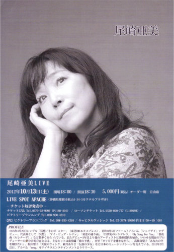 ども、久しぶりでございます。アパッチは今月イベントが3つ+α…なので告知などを。まずは…尾崎亜美 LIVE日時:2012年10月13日(土)開場18:00 / 開演18:30 料金:5,000円(税込)オーダー別 自由席ご存知「尾崎亜美」さんです。1976年3月シングル「冥想/冬のポスター」でデビュー。その後他のアーティストに楽曲提供をはじめ、ヒット曲も杏里「オリビアを聴きながら」、松田聖子「天使のウィンク」など多数。日本のミュージックシーンを支えているプロデューサーの草分け的存在。尾崎亜美さんの優しい歌声に聴き惚れてみませんか?ローソンチケットは売り切れ。アパッチに少々チケットが残っております。続いて…北のエレキガール TOMOKO LIVE日時:2012年10月18日(木)開場19:00 / 開演20:00 料金:2,000円(1ドリンク付)自由席道産子のエレキガールです。ベンチャーズの楽曲を中心に、ノーキーと一緒に全国ツアーを回る実力派。懐かしいエレキサウンドと楽しいおしゃべりのひとときを、あなたもその笑顔の虜になるかも?!バックバンドはアパッチバンドがつとめます。チケットの発売はアパッチのみ!最後に…アパッチ18周年パーティー芸人ヒロシとアパッチバンドの爆笑ライブコラボ!!日時:10月20日(土)【第一部】開場 18:30 / 開演 19:00(21:00 迄)【第二部】開場 21:15 / 開演 21:45(23:45 迄)※ 一部・二部、入替制料金:前売 4,500円 / 当日 5,000円 おつまみ付・フリードリンクと第一部・第二部の入れ替え制で、アパッチ創立18周年イベントとして、特別ゲストに「ヒロシです…」でお茶の間に笑いをお届けしているお笑い芸人、「ヒロシ」を招いての「アパッチ18周年パーティー」を開催いたします。こちらもチケットの発売はアパッチのみとなっております。…以上、駆け足で3つのイベントをご紹介。3つともチケットがアパッチに残りわずかですが残っております。お問合せは、098(868)7534 アパッチ迄チケットの購入はお早めに。最後に、27日土曜日にはアパッチバンドが、久々に…「伊平屋島ムーンライトマラソン」の後夜祭りに参加します。・・・のため、その日のアパッチのステージを守るのは、12時までは「おやじバンド・シルバーズ」12時よりあとは、実力派のバンド、「バンド名募集中?!」が出演。。。(ーー;となっております。10月は…bassken 老骨に鞭打って頑張ります。。。