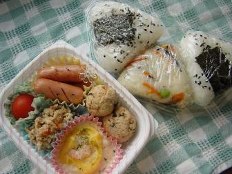 そんなこんなで、『おにぎ弁当♪』にしました「ポイッ」とできる100円ショップのおにぎり&おかずパック。。便利~