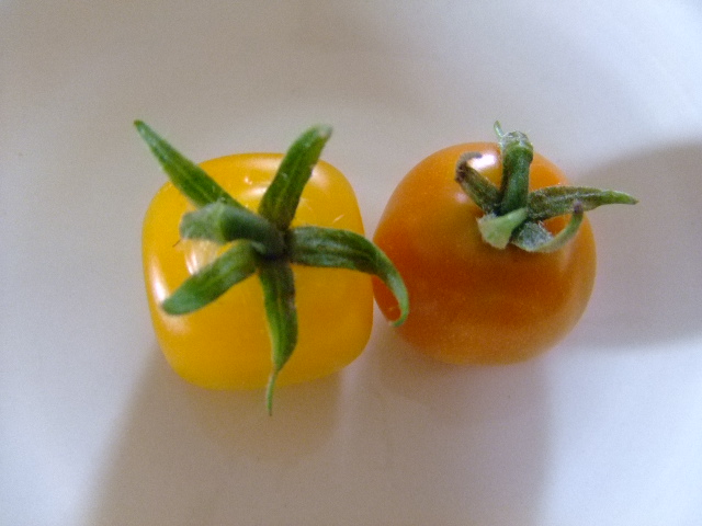お久しぶりです・・・たしか、前回は夏休みに入る直前だったような・・・あれから、ちょっと体調を崩し、ようやく、この暑さの中、復活しました!持病(?)の通年性アレルギー性鼻炎をこじらせてしまい、大変な思いをしてしまいましたちょうど疲労もピークに達していたのか免疫力がなくなっていたようで鼻炎→ヘルペス→腰痛という最悪なコースを約1ヶ月もかかり、ようやく復活しましたまだまだ厳しい暑さが続くようなので、皆さんも身体に気をつけて、残り少ない夏休みを過ごしてくださいねところで・・・我が家のミニトマトちゃん達。私が倒れている間にも、下の娘がしっかりとお世話をしてくれ、スクスクと育っておりました。そして、ついにっ!!!四角い黄色いミニトマトを収穫することが出来ました~ねっ!四角いでしょ・・・ ちょっと写真だとオレンジにも見えるけど、実物はきれいな黄色でした!4つ蒔いたタネのうち、元気に育った3つの苗。2つが黄色いミニトマト、1つが赤いミニトマトでした。四角い実にするためのカバーが2個しかないので、1個収穫しては、次の小さめの実にかぶせてという、地道な努力が必要なのですが、結構、楽しいですカバーをつけようとしている時にもげてしまった黄緑色のミニトマトちゃん・・・大きさは、かなりいいところまで育っていたので、キッチンの窓辺において赤くなるのを待ってます明後日から、ちょこっと旅行に出るのですが、水遣りをどうしようかと悩んでいます・・・ 毎年、頑張って育てた子達も旅行中にダメにしてしまうんですよね・・・皆さんは不在中の水遣り、どんな工夫されてますか?