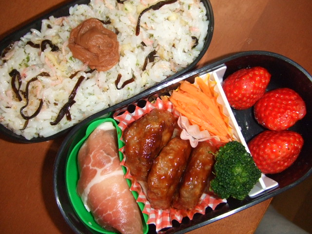 冬休みも終わり今日から新学期&会社のスタート久しぶりの痛勤電車は、しんどかった~そして、早起き&お弁当作りの生活を戻ってきましたよ~休暇中、夜更かし&寝坊生活をダラダラしていただけに辛いですね。本日のお弁当は・・・煮込みハンバーグポテトサラダの生ハム包み人参のマリネブロッコリーいちご桜エビ・揚げ玉・塩昆布のご飯と梅干・・・です。生ハムの中に隠れているポテトサラダは、こちら。ちょっとオシャレにと庭のローズマリーをさしてみたのに、上の娘が「これ、おでんくんみたいだね!」って・・・たしかに頭のチョンチョンは似てるかもだけどさ~~最初は気が重かったお弁当作りも最近は楽しみに♪美味しく、楽しく食育できたらいいなと思います。そういえば、今日は「七草」の日ですね。子供達には日本の文化もしっかりと伝えていきたいな~と思い、しっかりと調べてみました。1月7日は、七日正月、七日節句とも呼ばれ、朝、七草がゆを作って食べる風習があります。これは古くから全国的に行われている行事で、大昔は、七草とは米・麦・稗(ひえ)・粟(あわ)など七種の穀物をさし、これでかゆを作って食べてその年の五穀豊穣(ごこくほうじょう)を祈るという農民行事の一つであったといわれます。これがいつのころからか朝廷の行事にとり入れられ、穀物が、七種の野草や野菜にかわっていったようです。七草がゆの前日の6日は、野に出て若菜を摘む風習があったことが、宮廷歌人による若菜つみの歌によって、うかがい知ることができます。この行事は室町時代以後、儀式化し、江戸時代になると武家のあいだでも行われるようになり、正月七日が人日(じんじつ)という五節句の一つに決められました。このため、このころから広く一般でも行われるようになったわけです。正月七日に七草がゆを食べると、万病を避けられると言い伝えられています。今日では、七草というと「芹(せり) 薺(なずな) 御形(ごぎょう) はこべら 佛座(ほとけのざ) 菘(すずな) 蘿葡(すずしろ) これぞ七草」と歌に詠まれる七種類の若菜をいいます。ちなみに、なずなはぺんぺん草、ごぎょうは母子草、すずなはかぶの葉、すずしろは大根の葉のことです。皆さんは、七草がゆ、食べましたか?我が家は、スーパーで七草セットを覗いて終わりました^^;忙しい日々に終われることなく昔の人のように季節を感じながらスローライフを楽しみたいですね