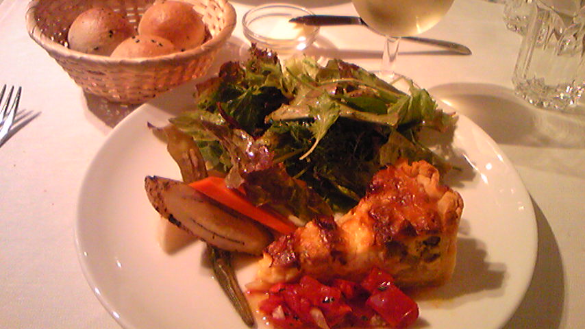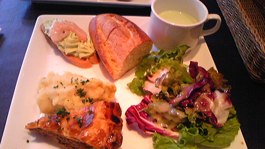 お久しぶりです~すっかり秋らしくなってきましたね。皆さんは、夏の疲れ、出てませんかぁ?私は、子供達の夏休みが終り一安心したせいなのか、夏の疲れなのか、9月に入ってからというもの心身共にグッタリ・・・こんな時は何もかもツイてなく、腱鞘炎再発→動く側の手を扇風機に巻込み→何もやる気が出ない→二度寝で寝坊~→1号は起きてから10分で学校へダッシュ毎日、何かしらハプニングが舞い込み、飽きない日々を送っておりました~こんな時は、やっぱり美味しいものを食べて元気をださなきゃ!ということで、写真は今日のランチです♪今日のメニューは・・・ *ミートパイ *カレー風味のポテトサラダ *野菜サラダ *グリーンピースのスープ *グリーンピース&クリームチーズとエビがのったラスク(←正式名がわからない~^^;) *フランスパン *コーヒーこれに白ワインでもついてれば最高なんだけどね~ここは、会社に近すぎて無理なんだけど・・・ちょっと離れたお店では、時々、ランチワインで午後の仕事に活気を与えています