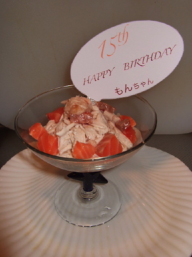 2/11 モンちゃんのお誕生日をやりました。なんと15歳!!おめでとう!!!! 実は日にちは勝手に決めちゃいました2月生まれと言うことは前から知っていたのですが,日にちがわからなかったので元ママに聞いたところ、もんちゃんママを飼っている友人と連絡がつかず、わからないとの事。。。じゃぁ覚え易い11日に 私の誕生日が6/11 ピックロの命日が5/11 もんちゃんの誕生日が2/11覚え易いです でささみとサーモンでケーキ?を作ってお祝い!!ウエット、ササミ、ウエット、ササミ、サーモンのトッピングという風に重ねミルフィーユにしてみましたおいしそぉ~~~はい、完食写真を撮るために食卓の上に乗せましたが、食べるときはちゃんと自分のお食事スペースで食しましたよお行儀が大事です。。。ピックロだったら写真を撮ってるすきに手がにゅ~~っと伸びていた事でしょう。。。これからも元気でお茶目に長生きしてね私からの心からのお願いです。他にはなぁ~んにもいりません。ずっとずっといっしょにいてね。ハッピーバースディー もんちゃん
