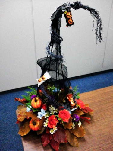 今年もあと2ヶ月ちょっと。。。早い、、、ここまで来ちゃうと年が明けるのに加速がつく。。。毎年の事だけど「ハロウイン」から「クリスマス」「お正月」「バレンタイン」「ひな祭り」次々に行事が押し寄せる。。。デザインがスイッとうかぶ時はとっても楽しくなるけど、、、まぁ、産みの苦しみを味あう。。。がんばろ。。。まずは「ハロウイン」今年は魔女の帽子をイメージしました。太い番手のワイヤーとリボンで帽子の部分もつくりました。最近、何でも資材屋さんで売ってる気がする。。。先生の手間が省けるけど、つくれるものは自分でつくる方が良い様な気がするな。。。そういう技術を持ってない先生がふえてるってことかしら?ま、人の事はさておき、これから数ヶ月がんばりまぁ〜ス!