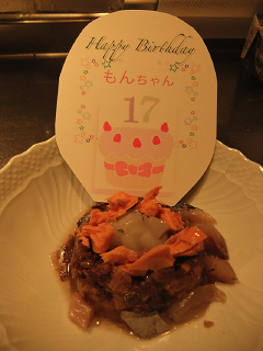 もんちゃんのお誕生日をお祝いしました。今年で18歳みんなに「そんな年には見えないね~~」 と言ってもらえるくらいもんちゃんはとっても元気です 毎年すこ~し豪華に盛りつけて。。。 ごはんと一緒に写真を。。。。もう、欲しくてしょうがないから動いちゃってボケボケですが。。。あんんまりじらしてもかわいそうなので。。。どうぞもっといっぱい長生きしてね。。。