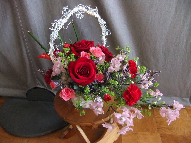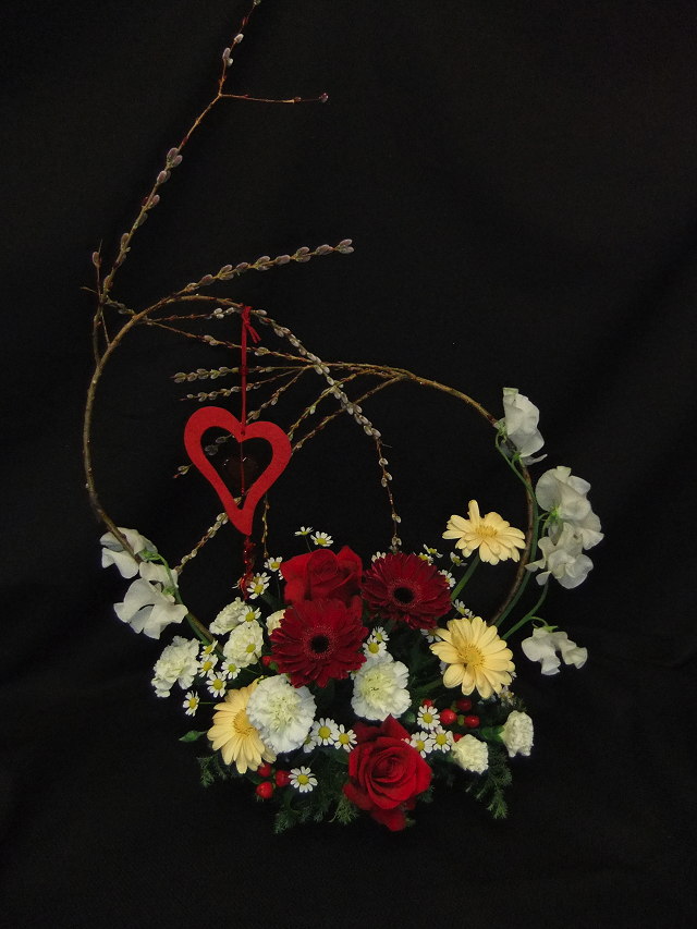 2/14 「バレンタインデー」 ですね。今年は月曜日なので、義理チョコの売り上げが増えるのかなお教室では「バレンタインデーアレンジ」をレッスンします。でも、生徒さんはあげる目的ではなく、お家に飾るようなので、あえて、ギフトという感じはなく、普通に飾れる様なデザインにしてます。アズキ柳と言う小さな赤い芽を付ける可愛い柳で「ハート」を表現して。。。柳をためるのが少々難しかったかな。。。でも、コツをつかめば大丈夫誰も折ったりせず、上手にできていました上のデザインはちょっと難しいのでこちらのデザインにしたお教室もあります。これはスイートピーのステムの中に、ワイヤーを入れて曲げるので比較的簡単にいけられますでは、ハッピーバレンタイン
