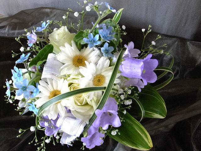 欧米では「ジューンブライド」6月に結婚すると幸せになると言う言い伝えがあります。今日のように気持ちのよいお天気だと良いのですが日本では雨の多い、結婚式にはあまり向かない季節です。それでも、この時期に合わせて、ブライダルブーケのレッスンをします。今回は純白のガーベラにサムシングブルーのブルースター。可愛いブーケができました。