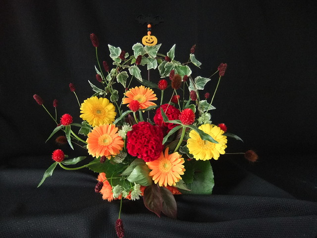 野球シーズンも終わり、、あ、まだか雪ももう少し待たないと降らないし。。。でも、このお仕事をしていると、とても忙しい時期に突入。。。まずは10/31 もうすぐハロウィンです。先日生け込みもハロウィンっぽくしましたがレッスンもハロウィン日本のお盆の様な行事ですが色合いやキャラクターが可愛いので毎年、皆さん楽しみにしているようです。去年、渋めの色合いにしたので今年はかわいい色で。。。綺麗な色のケイトウを入れて下さったお花屋さんに感謝、感謝、感謝。。。?昔のケイトウと違って最近は発色も、形も綺麗なケイトウが増えました。さて、これからはクリスマスやらお正月、バレンタインと忙しくなります。がんばろっと。。。でもその前に、お楽しみが待っているんですこれはもんちゃん、私の席を占領の巻き。。。