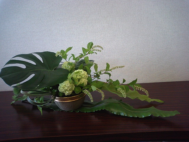 まだ五月なのに、もう梅雨って感じのお天気が続いています蒸し暑くはないですが、うっとうしいです。。。で、こんなお天気の時にはさわやかなアレンジで、気分転換グリーンだけのアレンジメントのレッスンをしました。