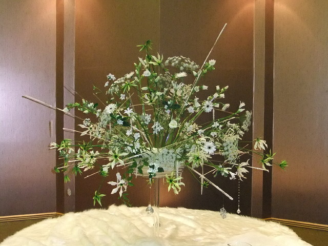 先日目黒雅叙園にて、所属スクールの50周年記念花展が開催され、出展いたしました。ブライダルやイベントの生け込みもやりがいはあるのですがクライアントさんの意向に添っての作品作りですので自分のやりたい事を思いっきり表現できる、作品展はとても楽しいです。前回の作品がシックな色合いで作ったので今回は「白」を主体に。。。「白」といってもお花の種類やテクスチャーで、様々な「白」があるので、その違いを表現できればと思いデザイン、材料を考えました。また、透明な素材を使い、フワッと浮いているように。。。表現できたかなぁ~。。。写真ではスケール感が出にくいですが2mの円卓の上に乗ってます。好きな星をひとかけら。。。