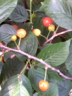 もう一年経ったのかぁと思う事のひとつ。 今年も実家のサクランボが実っております。 まだ小さいけれど。 だからこそ まだ 無事に実っているのかな… 今は た~くさん 小さなコたちが赤く色付いております。 前回 サクランボのことを記した日記を読んでくださっている方々は、 実ったサクランボを母親だけが食したことをご存知だと思います。 「甘かった」と言っていた母親。 しかしっ! 他の家族は味を知らないまま… そして その後 母親も再びその味を味あわないまま… サクランボは鳥達によって 食べられてしまったのでありました。 母親によれば 朝早くに鳥がきていたとのこと。 今年こそはっ と、今 実家のサクランボ達には網がかけられております。 たくさんのコたちが 今年は実家の食卓にやってくるのでしょうか。 さてはて。