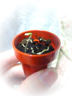この写真は、旦那くんと食材の買出しに行ったときにみつけたもの。と、いうのは 飲み物のところを歩いていたら、三○矢サイダーに景品としてついていたんです。いくつもの種類があって、その中でも初級・中級・上級とあるんです。まずは、よく植木などを栽培している私の両親にあげようと上級のものを選んで一本購入。後日、我が家でも育ててみようということになり、初級のものを選んで再び購入。その初級のものとして、育て始めてみたのが このお写真の『ラディッシュ』。ひとつの小さな袋に芽がでて一週間まで育てる鉢や腐葉土、種が入っているんですよ。今、この『ラディッシュ』ともうひとつ『サニーレタス』が我が家のテレビの上におります。『サニーレタス』はまだ芽がでてきていないのですが、『ラディッシュ』の方は、なんと芽がでてきたコがいたのであります!これは、一週間の間に土に植え替えなければ。芽がでた記念にカシャッと撮影してみました。大きさがわかりやすいように二枚目は旦那くん私用のたばことともに。さてさて、もっと育ってくれるでしょうか。