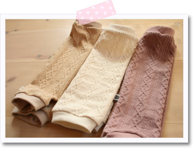 昨日からついに待ちにまった3日間限定「slowboat」さんの通常販売がはじまりましたーっ毎回すぐ売り切れて買えてなかったので意地&必死で(笑)19時からPCに釘付けでしたそして!やりましたー!なんとかOPENと同時にカートに入れはじめる事ができましたのに…それでもパックは買えずじまい…がーん、皆さん早いですよねー。どうやったら買えるのかな…。でもとりあえずお目当てのものはいくつか買えたのでよし!と満足する事にしますとタイトルからずれちゃってましたが…。本当に寒くって(ストーブ代をケチってるせいもありますが)毎日スパッツの上にレッグウォーマーを娘に履かせています♪でも…このレッグウォーマー!なかなか気に入ったのがなくってしかも可愛いっ!と思ったら結構お高いので作ってみました!とりあえず今うちにある服に合わせて3色!あっという間で楽しかったですーしかもなぜか娘がとっても気に入ってくれたみたいで毎日必ず履いてます嬉しいなぁー。そういう姿を見ると俄然作ろうモード突入ですー(笑)次は何を作ってあげようかなぁ…。このアラン風ニットはPomulさん♪何度か洗濯しましたが、全然へこたれなくって(笑)とっても気に入ってます♪送料無料企画が終わってしまって残念ですー