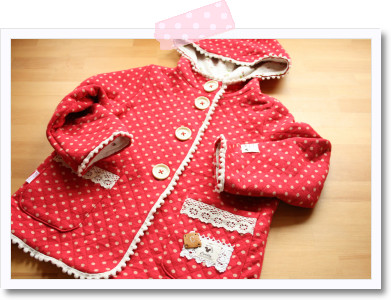 やっとやっと出来ましたhibi+さんの裏地付フードコート100サイズです♪裏地付なのでちょっと時間がかかっちゃいましたが表はキルトニット&裏地はイチゴ柄の接結ニットにしたのでまだ楽につくれたのかも?です。中表でぐるっと縫って、BAGを作るかのように引っ張りだすのですが、これが裏地も厚手なら大変だったかも…ほっ。シンプルなものを(赤を選んでる時点で違う?!(笑))とおもったのですが作っているうちにどんどん可愛くしたくなってきちゃって最後は手縫いでぼんぼんテープをつけちゃましたボタンも今ちょうど夢中になってる娘に合わせて大きくしてみたのですが嬉しそうに何度もとめたりはずしたりしてるので、もう既に伸び気味?!(笑)です。ボタンホール…初めてに近いほど作っていなかったのでちょっと失敗したのも影響してますがとりあえずは喜んで着てくれているのでよし♪としますちなみに…ボタンホール…ミシンについている機能を使ったのですが……この場合はニット用にした方が良いのでしょうか?普通生地用でしょうか??…ほんとーに独学なのでぜーんぜんわかりません…時間もないので勝手につくっちゃいましたが、今度調べなくっちゃ(笑)次は…冬物の厚手パンツつくりますー!ついに雪が積もったのに、冬物全然足りませんっ…
