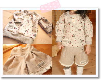 petit etalageさん♪closeしちゃいましたねー。新作コートはあっという間に売り切れだったような?追加注文しようかな?とおもったら売り切れてました!とりあえずワンサイズだけでも早めに買っておいて良かったですぅ。ほっ。本格的に寒くなってきたので、暖かいものを作ろう!とおもっていて。やっと今回petit etalageさんセット?!(笑)を作りました♪●インパーデットズボン 100●ドロップドスリーブプルオーバー 100 です♪最初にズボンを作ったのですが、厚地で作ったせいか心なしかぴったりすぎ?!(笑)きっと少し肥えたら着られないだろうなぁ…。あ、でもウエストのゴムをちょっと長くすれば大丈夫かな?(笑)でもラインは凄く可愛くって凄く気に入りました!なんだかこの頃特におもうのですが、こういうのは平置時よりも着て見た方が断然可愛いですね出来た瞬間はあれ??と思った裾の広がりですが、着てみたら全然気にならなくって!前後のタックがいい感じです♪とても気に入ったので、今更に2着製作中です(笑)あまりにもパンツが気に入ったのでこれにあったトップスを♪と作ったのがプルオーバーなのですが…そのままのサイズで作ったら、袖も丈もなんだか微妙?!なんでかなぁ?平置き写真では可愛く見えるのにこちらは実際着てみると、あれ??と(笑)わかりにくいかもしれませんが、袖は中に重ね着してるのがちょっと見えてます。ので実際は七分っぽい?!ウチの娘…私に似たせいかちょっと腕が長いせいもあるんですねーきっと。今度作る時は裾も袖もどちらともリブをちょっと長めにしようかな?とおもってます♪