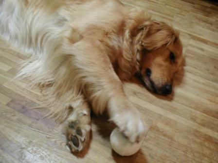 アリスはボールが大好きで、いつもボールで遊んでいます^^寝る時もボールをくわえてベッドに入ります(^_^;今日は公園でいっぱいボール投げをして遊んだけど帰ってからもまだボールを手でコロコロして遊んでました^^でももう眠そう・・・