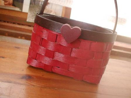 お友達に教えてもらってクラフトテープで作ったカゴです^^テープは茶色だったので赤にペイント。ハートは押しピンだったけど、ピンが取れたのでくっつけてみました♪