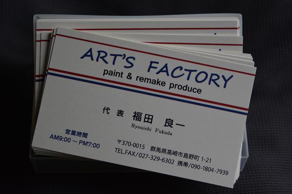 悩みに悩みに悩みまくったアレが・・・・・・・・ そう 名刺が完成しました ということは、社印も作れちゃったし、ワコ★ズとも契約できちゃうし皆様にお配りするナンヤカヤアレヤコレヤも発注できちゃう そんなわけで、グランドオープンは ドゥルルルルルルル ジャーーーーーーーーーーーン 来月、10月26日(大安)に決定いたしました パチパチパチ さっそく、工場前に取り付けてあった前の使用会社の看板を撤去って遅っ ささやかですが、粗品をご用意しておりますので、どうぞ皆様、遊びにいらしてくださいね 朝9時から、下記の住所地にあります工場でお待ちしておりま~す ・・・ART'S FACTORY・・・住所:群馬県高崎市島野町1-21TEL/FAX:027-329-6302業種:鈑金塗装事業内容:自動車・バイク・ボート・自転車などの鈑金塗装・オートバイのカスタム・レストア・鈑金塗装・車検・修理・部品製作などなんでもお受けいたします。