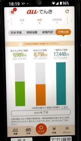 うちの電気は、au電気です。他の家等との7月の使用量が少ない。